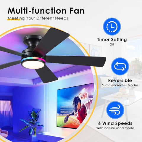 46In RGB Ceiling Fans with Lights - Black Flush Mount Ceiling Fan Light with Remote/APP, RGB+3CCT 6 Wind Speeds, Modern Low Profile Fan Light Fixture for Party, Kid's Room