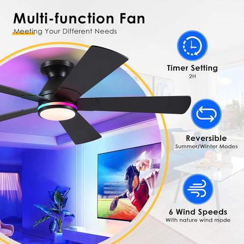 52In Black RGB Ceiling Fans with Lights - Flush Mount Low Profile Ceiling Fan Light with Remote/APP, RGB+3CCT 6 Wind Speeds and Reversible, Modern Fan Light Fixture for Party, Kid's Room