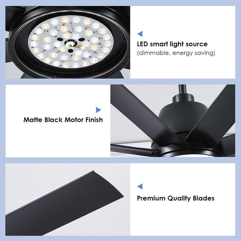 72" Black Ceiling Fan with Lights and Remote Control - Large Industrial Ceiling Fan with 8 ABS Blades, Dimming, DC Motor Reversible, Indoor/Outdoor Modern Ceiling Fan for Living Room, Black